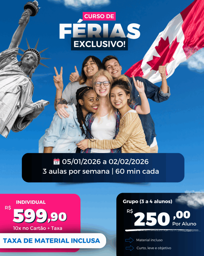 Oferecemos aulas de inglês em grupo de até 4 pessoas, criando conexão e troca entre os alunos. Também trabalhamos com aulas individuais e particulares, totalmente personalizadas, além de cursos para empresas e programas especiais para crianças a partir de 8 anos.