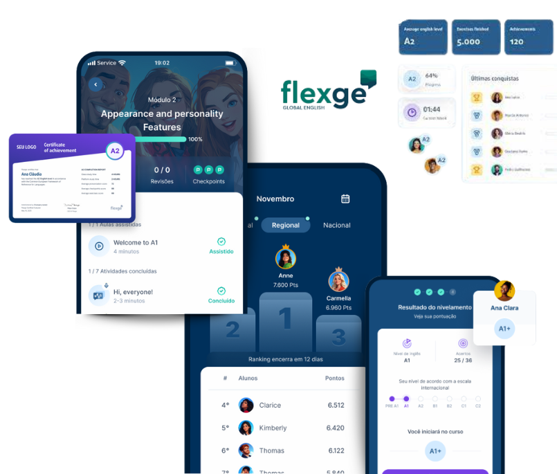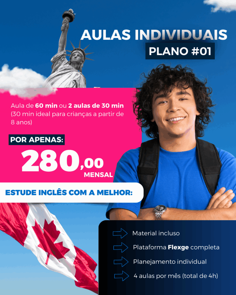 Desde a primeira aula, você aprende a se comunicar. Em parceria com a Flexge, oferecemos uma plataforma completa de estudo do inglês, onde você pratica escuta e fala com nativos, tornando o aprendizado natural, contínuo e acelerado.